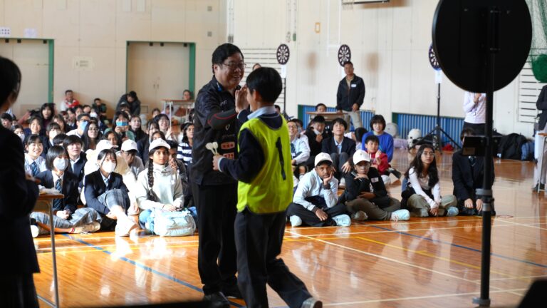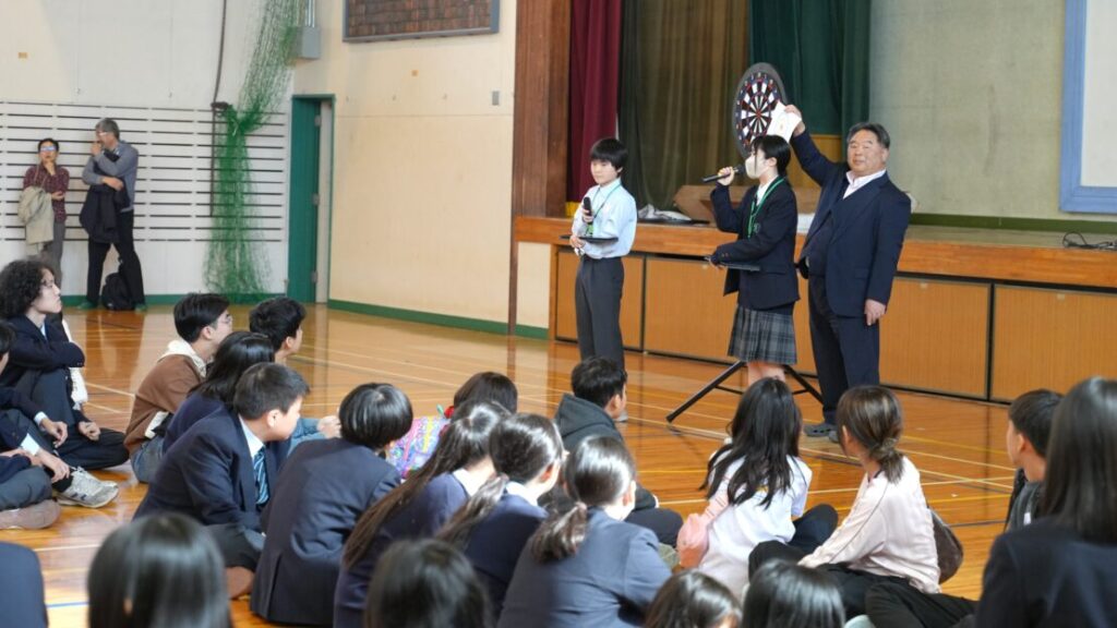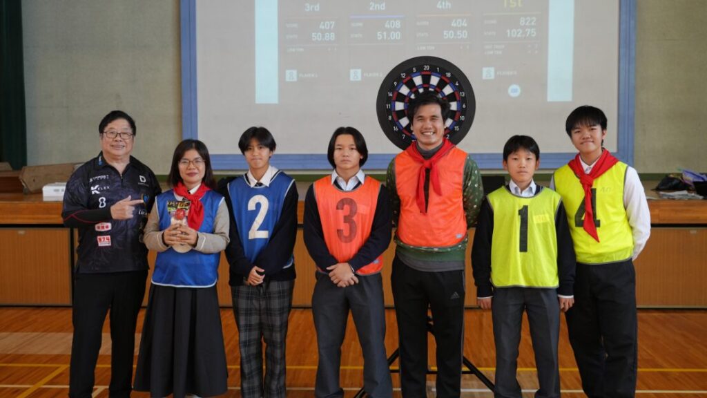 体育館に設置された10台のダーツボードには、小学低学年から大人まで幅広い年代が参加。生徒たちは「ポン!ポン!ヒュー!ブル!」と擬音を使ったリズミカルな説明で投げ方を伝え、参加者は笑顔でダーツを楽しみました。