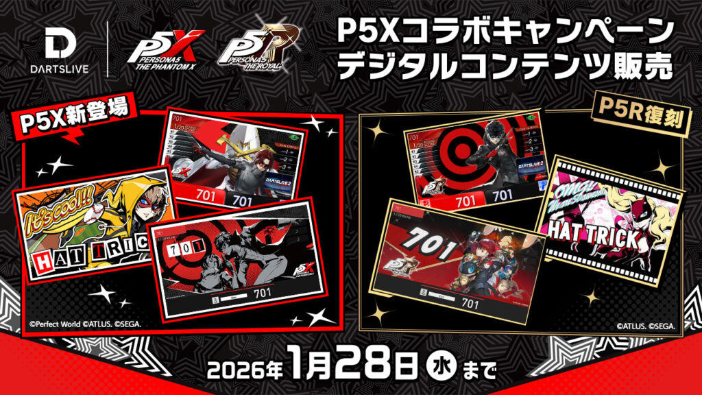 ダーツライブのオンラインマシン「ダーツライブ3」「ダーツライブ2」にて、コラボゲーム「P5X 501」を期間限定で展開いたします。プレイ条件を満たした方を対象に、デジタルコンテンツのプレゼントや抽選キャンペーンを実施いたします。