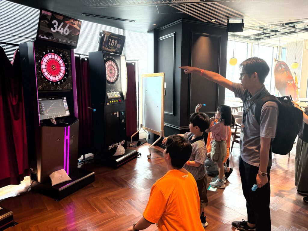 ▲社員が社員のファミリーにダーツを教えるシーンも!